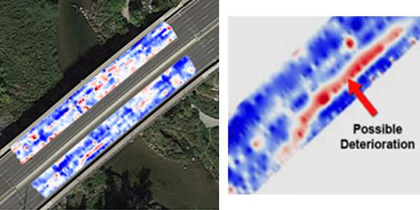 Monitoring the state of bridge decks is an ongoing need to evaluate deterioration. Corrosion of reinforcing steel and delamination of asphalt and concrete can be sensed with GPR.