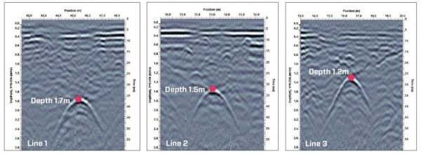 از آنجا که GPR میتواند تمام تأسیسات، از جمله لولههای فلزی و غیر فلزی را شناسایی کند، تصویر کاملی از تمام تأسیسات دفنشده در یک سایت پروژه میتواند در اوایل برنامهریزی پروژه تکمیل شود. این مثال یک لوله آهنی ریختهگری و یک لوله PVC را در اعماق مختلف در وسط یک تقاطع شلوغ نشان میدهد که در برنامهریزی تأسیسات آینده کمک کرد.